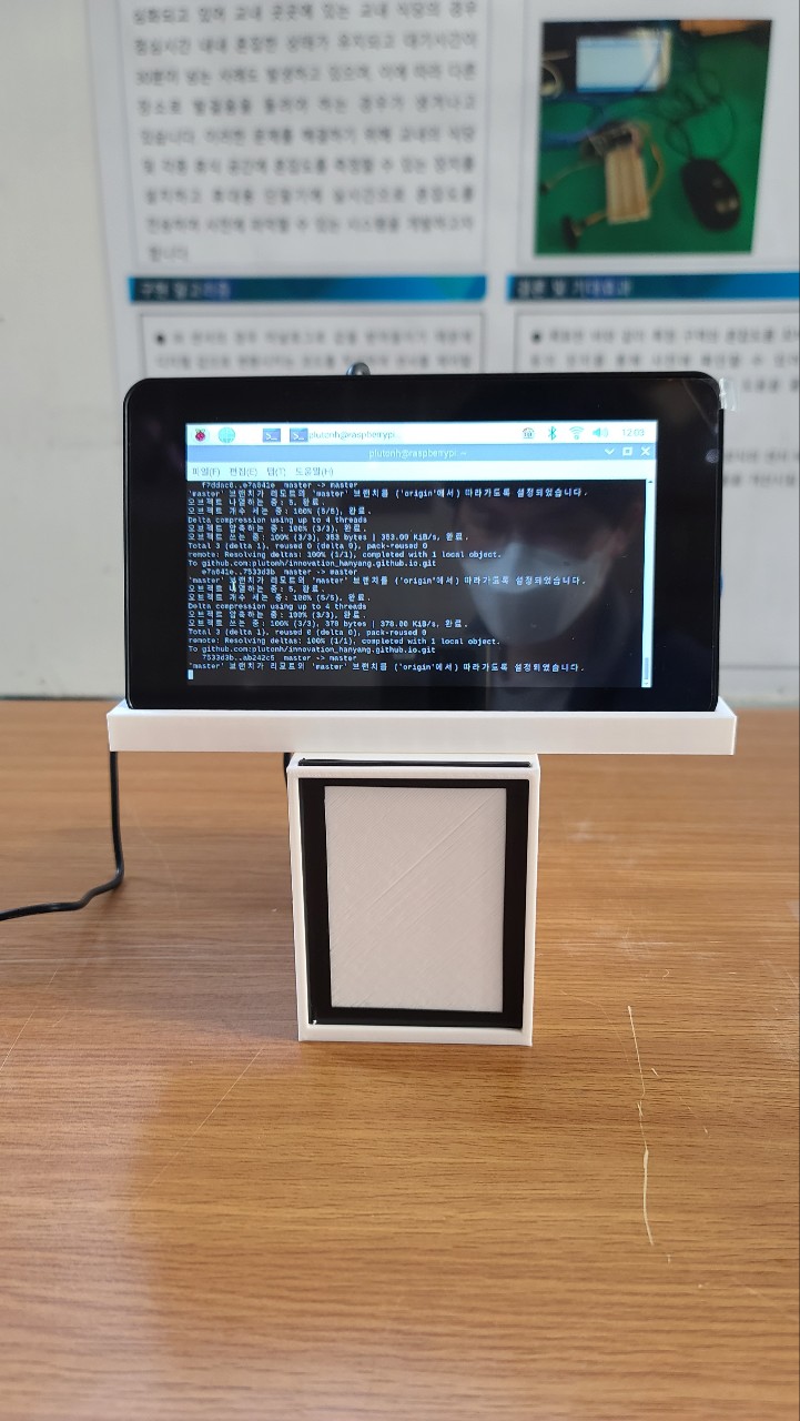 USB 케이블을 통해 아두이노와 연결되며 아두이노와 각종 센서에 전원을 공급하게 됩니다. 아두이노에서 수신한 데이터를 이용하여 혼잡도를 측정한 다음 이를 html 파일에 저장하고 깃허브 원격 저장소인 ‘innovation_hanyang.github.io’ 의 웹페이지에 html 파일을 업로드하는 역할을 수행합니다.