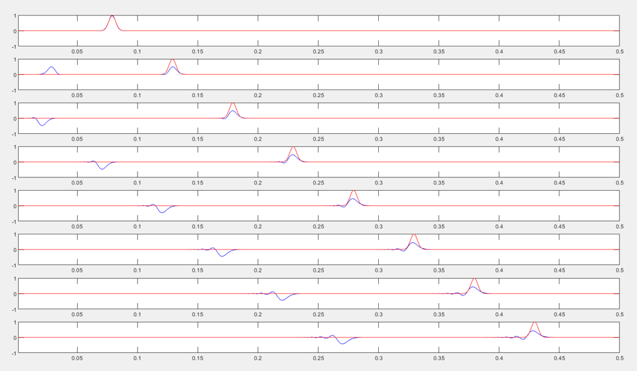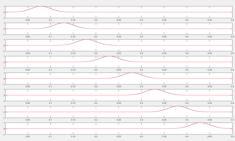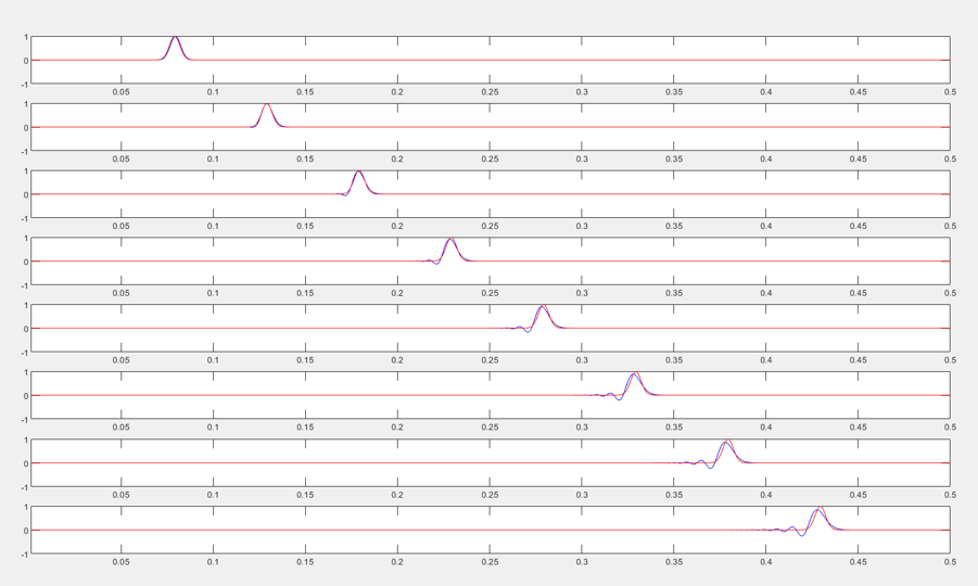 다음 아래 3개의 그래프는 이론값과 FDTD를 적용했을 때의 E wave를 비교한 것입니다. 빨강이 이론값, 파랑이 FDTD를 적용했을 때의 그래프 입니다. dt = 1.67*1e-12로 700번 돌렸고 각각 time step이 0, 100, 200, … 700일 때의 그래프 입니다. PEC로 boundary를 설정해서 반사파가 오는 것을 확인 할 수 있습니다.