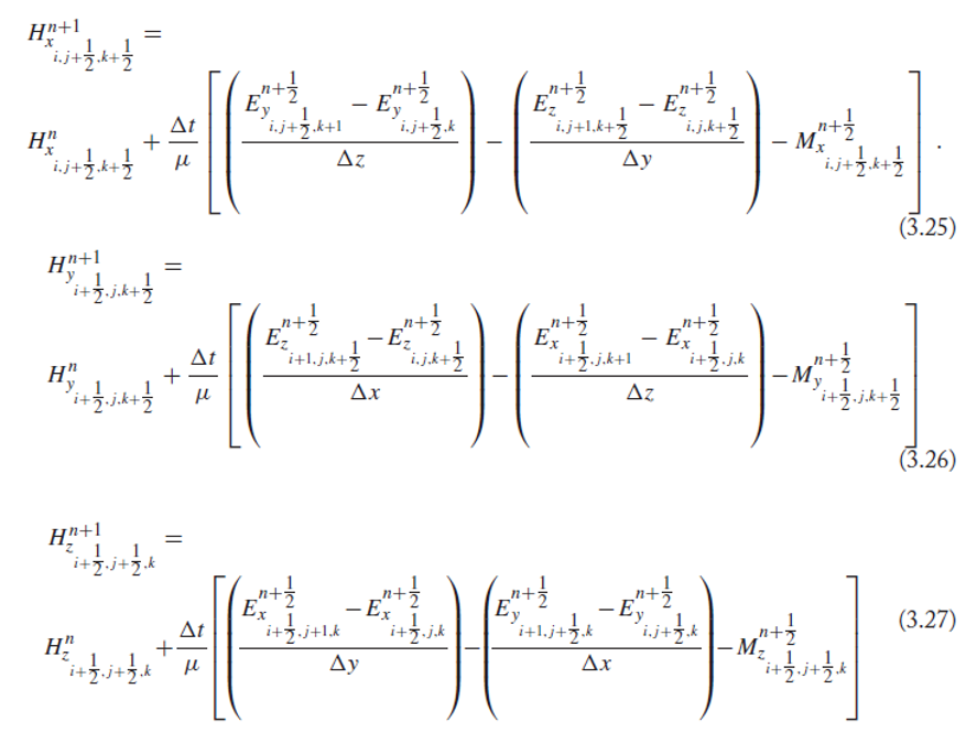 이 식의 의미는 leap frog time-stepping이라고 할 수 있습니다. 앞의 식과 뒤의 식이 계속 연결되면서 다음 영역과 시간대의 E값과 H값을 알 수 있게 쭉쭉 전개됩니다.
