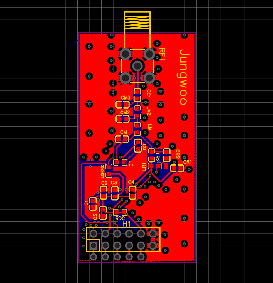- PCB 아트웍 설계하는 과정에서, 통신에서의 노이즈 발생을 줄이기 위해, PCB의 금속 가장자리를 여러 개의 비아로 둘러싼 다음, 겉면을 GND로 코팅하였습니다.