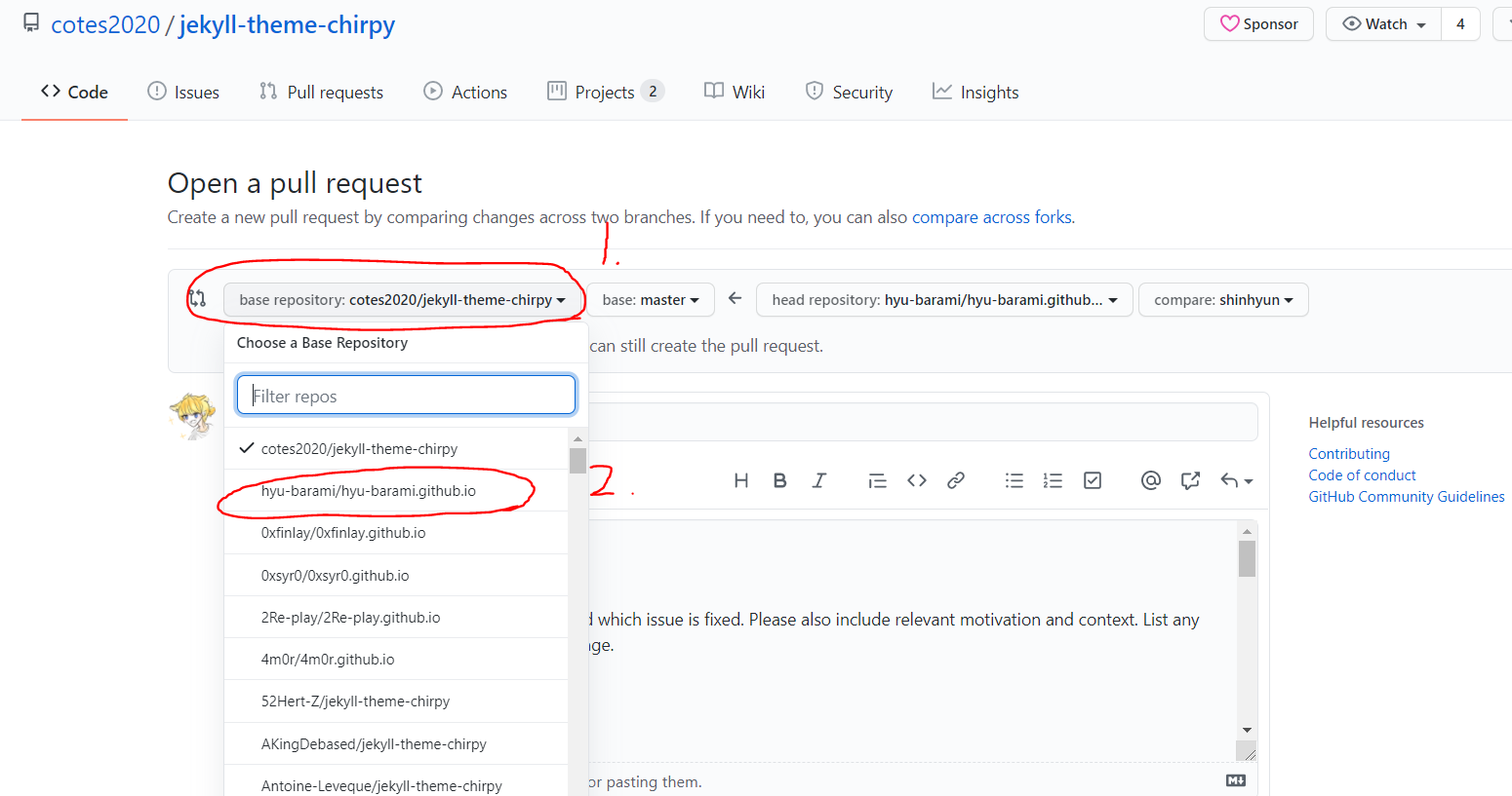 풀리퀘 보내는 대상 레포지토리를 hyu-barami로 변경해준다.