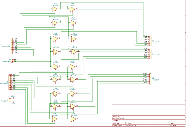 3-state buffer(이하 버퍼) 회로는 pulseIn, 신호 입력, pulseOut으로 나뉜다. 신호 입력단에 0을 입력하면 버퍼가 pulse를 통과시키고 1을 입력하면 pulse가 버퍼에 막힌다. pulseOut은 위 optocoupler 회로의 tr1~tr6와 연결된다(optocouplr회로기판은 총 3장). 버퍼에 주는 신호값을 아두이노에서 정하는 방식으로 트라이악을 제어한다.