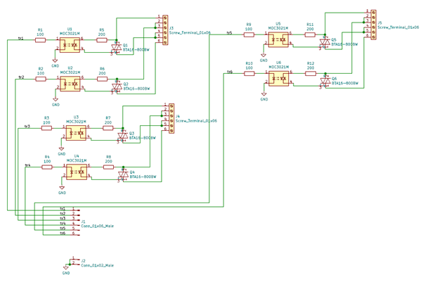 적절한 타이밍에 tr1~tr6에 펄스를 넣어주면 J3, J4, J5에 연결된 히터에 AC전류가 흐른다. 펄스 공급을 중단하면 AC 순시전압이 0이 되는 순간부터 전류가 끊어진다. MOC3021(U1~U6)소자는 optocoupler 소자로 고전류 고전압인 AC 회로와 저전압, 저전류인 DC회로를 분리한다.