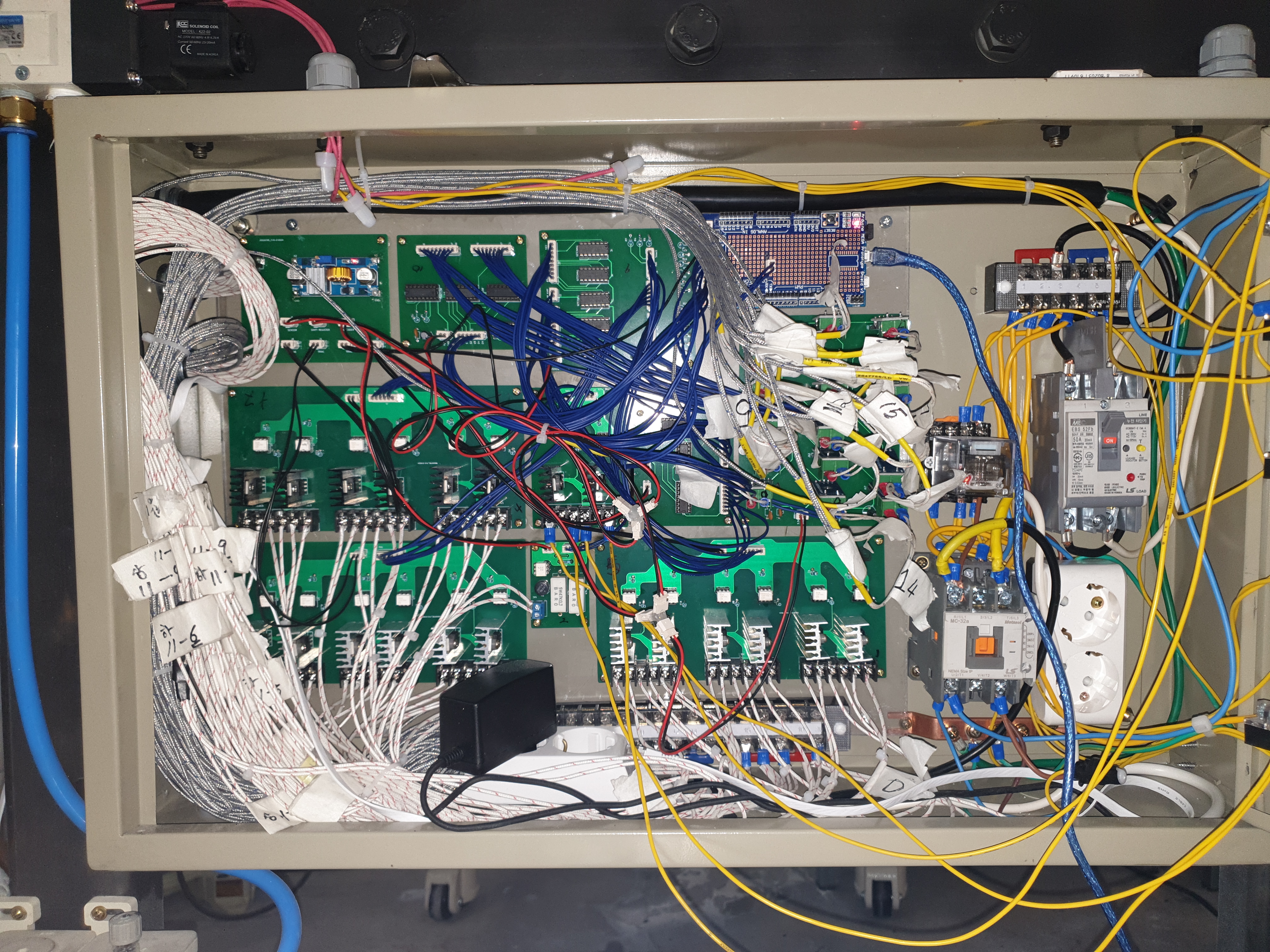 220VAC 교류 히터를 제어하기 위해 양방향 스위칭이 가능한 소자인 triac을 사용하였으며, 다수의 triac을 제어하기 위해 각각의 제어 신호를 shift resistor를 이용하여 제어 신호를 3-state buffer에 입력하고 zero-detecion 회로를 통해 알맞은 타이밍에 제어 신호를 발생시켜 buffer를 on/off하는 방법을 통해 교류 히터의 전력을 제어할 수 있다. 또한 K-type 온도 센서를 통해 교류 히터의 온도를 측정하고 목표 온도와 비교하여 ON/OFF제어를 통해 오차 10도 이내의 범위에서 교류 히터를 제어할 수 있다. 솔레노이드 밸브 역시 220VAC로 동작하기 때문에 triac을 사용하여 같은 방법으로 제어한다.