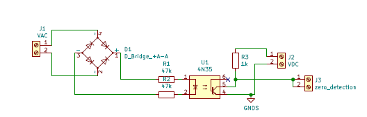 220VAC를 브릿지 다이오드를 통해 정류해서 저항을 통해 Photocoupler 4N35에 220VAC와 같은 위상이지만 낮은 전압의 정류된 신호를 만들어 준다. 4N35의 1차측에 전압이 걸리게 되면 2차측의 bjt가 작동하게 되어 zero detection 신호가 0이 되게 된다. 1차측 전압이 0인 경우에는 bjt가 동작하지 않게 되고 zero detection 전압이 VDC가 되게 된다. 따라서 220VAC의 전압이 0이 되는 순간에 pulse를 발생시키게 된다.