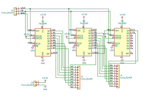 아두이노에서 바로 신호를 넣는 방식은 아두이노의 pin개수 부족, 신호 전류량 불안 등의 이유로 불안정하다. 따라서 shift register에 미리 정한 신호를 저장하고 shift register 출력과 버퍼 신호단을 연결하는 방식을 택했다.