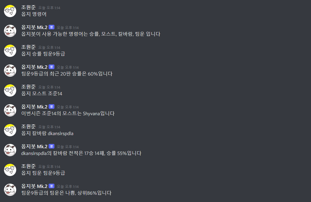 - 초대한 서버의 디스코드 채팅 채널에 “옵지 ‘명령어’ ‘닉네임’“을 입력하면 본인의 봇이 명령어에 맞는 결과를 출력해서 알려준다.