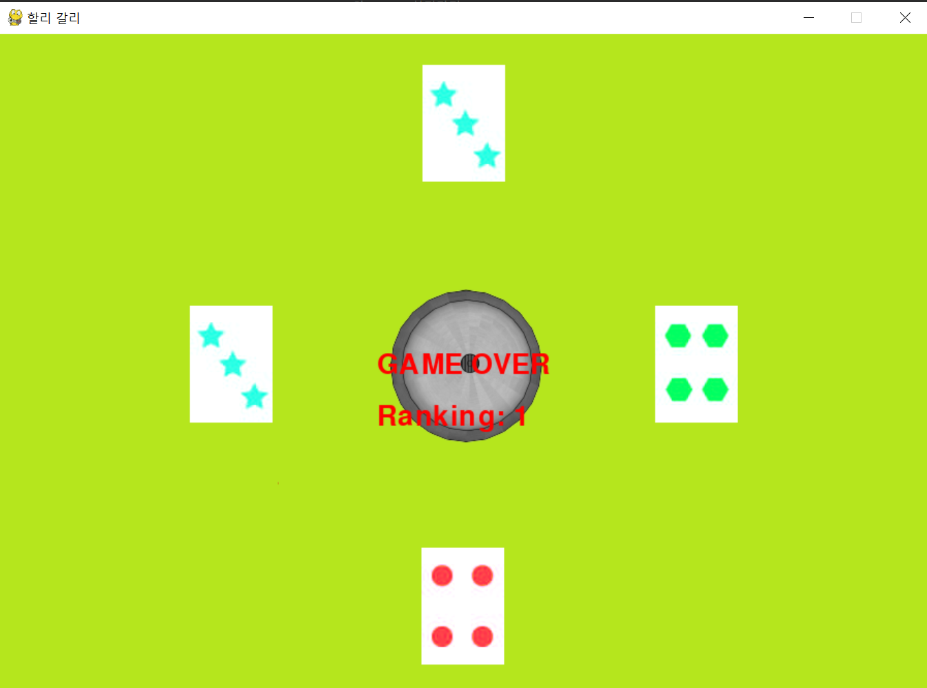 할리갈리 게임을 가져오되 기존의 방식과 다르게 시간 내에 치는 것을 목적으로 하며 마지막으로 나의 순위를 매기는 방식으로 변경하여 진행하였습니다.