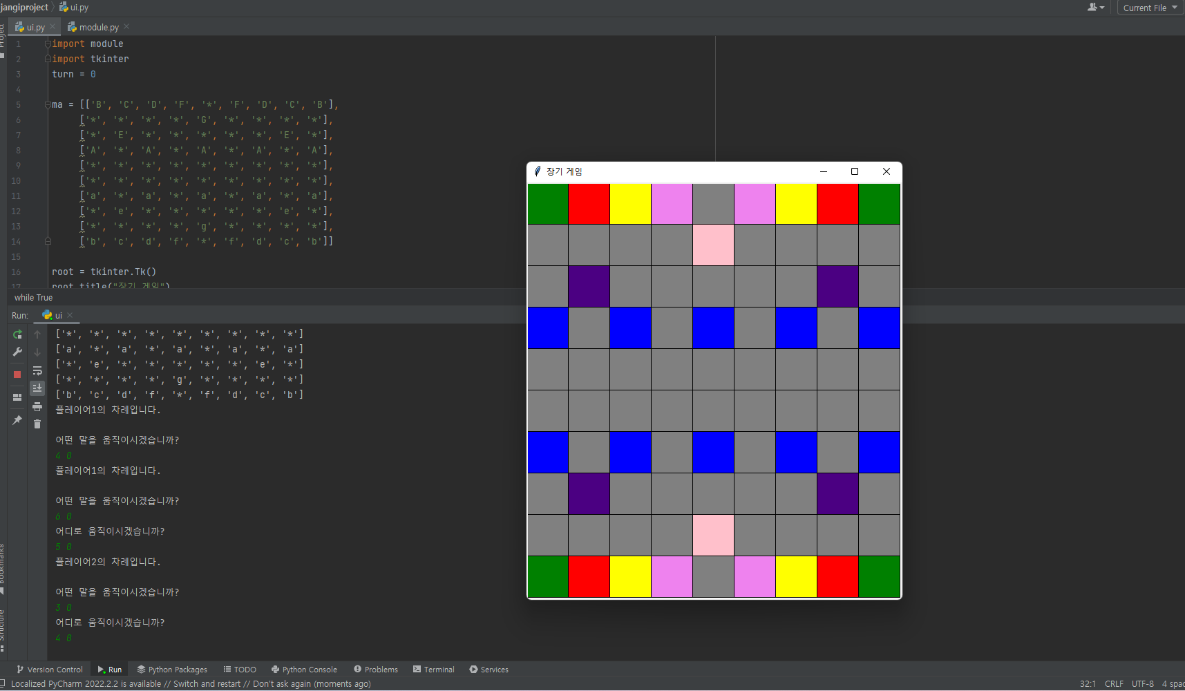 - module에서는 ui에서 입력받은 값에 따라 장기말이 움직이도록 다수의 함수를 넣었습니다. 플레이어를 구분하는 함수, 입력받은 값이 무슨 장기말인지를 판단하는 함수, 장기말에 따라 움직일 수 있는 칸을 제한시키는 함수, 잘못된 칸을 선택하면 다시 입력하게 하는 함수 등을 넣었습니다.