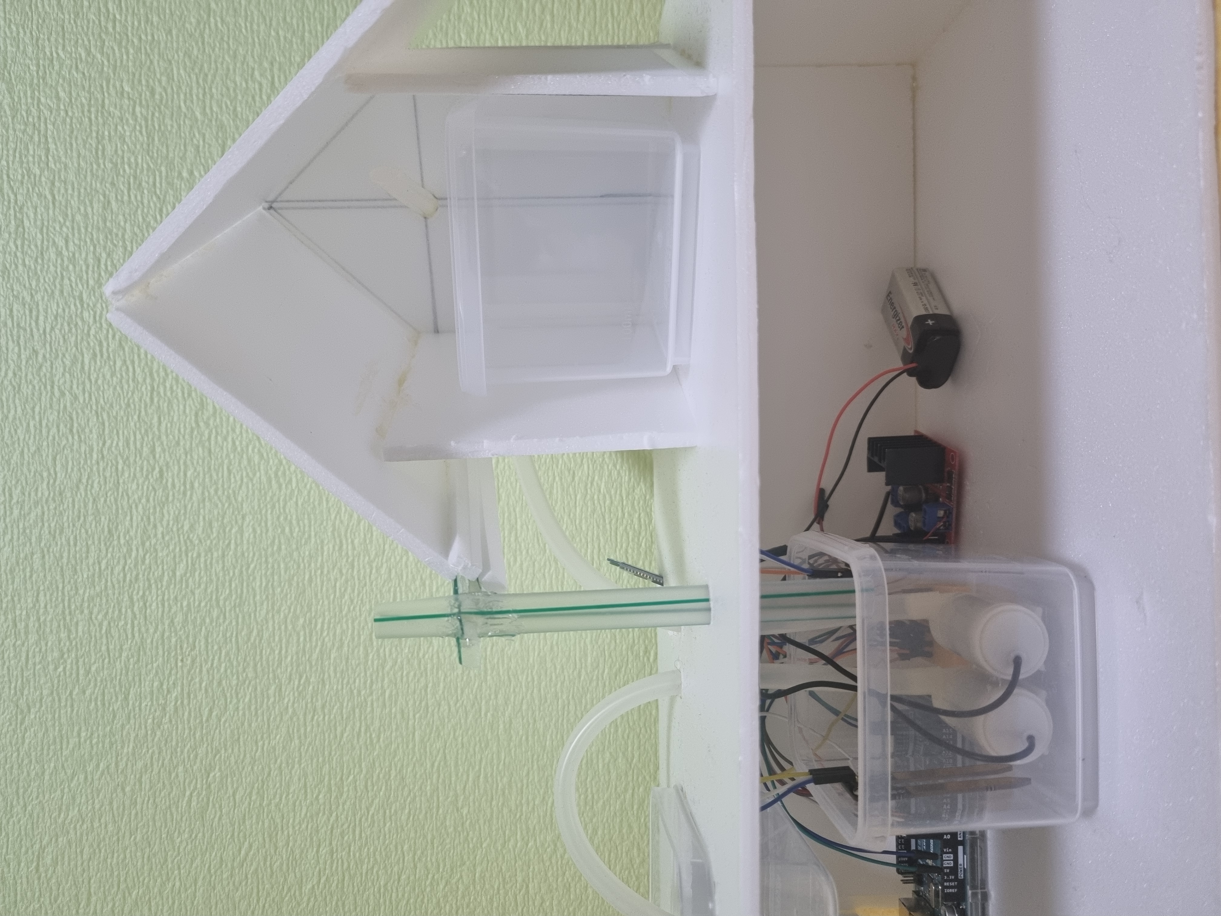 두 개의 수위센서를 빗물이 저장되는 플라스틱 용기에 부착하고 두 수위 센서의 측정값의 평균값을 수위 측정에 이용했습니다. L298N 모터드라이브로 두 개의 수중펌프를 제어하였고 외부전력으로 9V 전지를 연결하였습니다. 블루투스 모듈을 연결해서 휴대폰과 블루투스 통신이 가능하게 했습니다. 물을 보낼 위치를 휴대폰으로부터 전달받으면 설정된 위치에 해당하는 모터를 작동시킵니다.