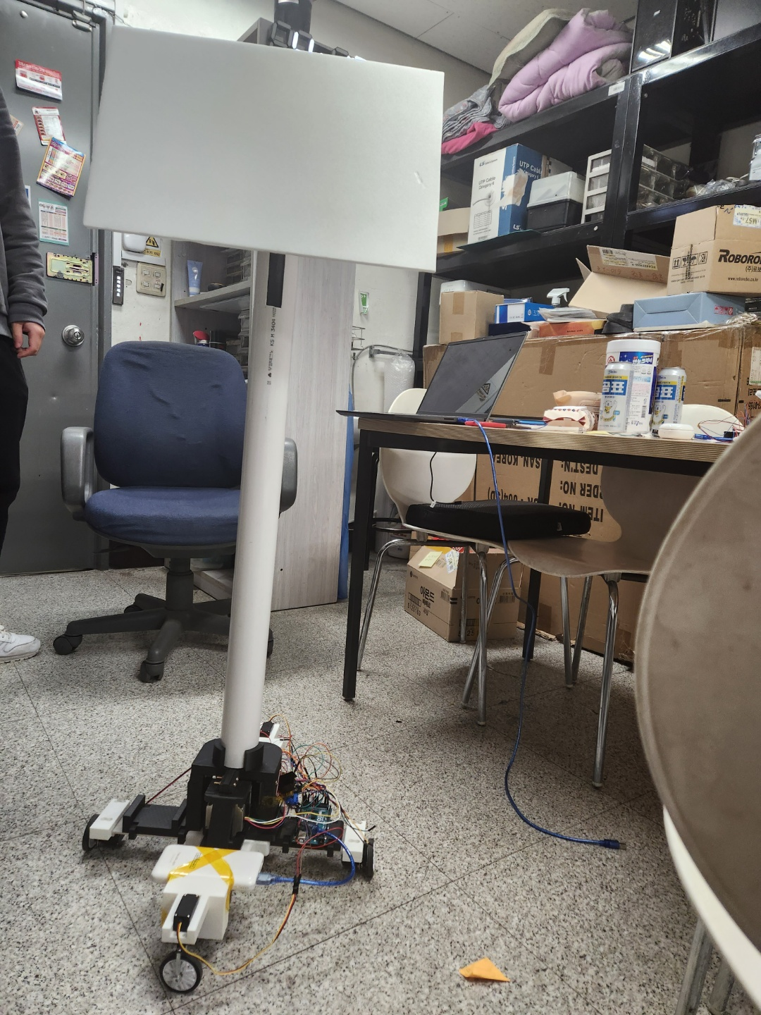 - 바닥의 중앙에는 Stepper모터가 올라가있는데, 두 개의 파이프가 동축 케이블 모양으로 존재하는 스탠드의 몸통 부분에서 고무벨트를 이용하여 작은 파이프를 수직운동시켜 높낮이를 조절하는 기능을 한다.
